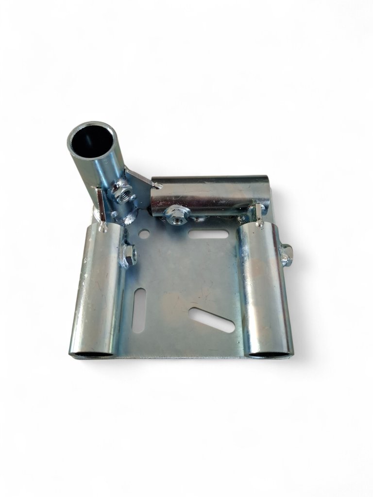Rohový spojovací držiak rúrok s otvormi na upevnenie koliesok s platňou. Farba strieborná. celý popis a parametre