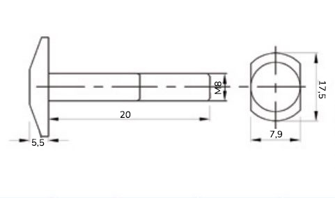 Skrutka s T-hlavou na pripevnenie príslušenstva k hliníkovým profilom. Dĺžka skrutky 20 mm.