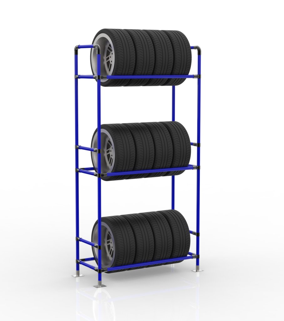 Stojan na pneumatiky z rúrkového stavebnicového systému s tromi policami. Praktické skladovanie až 12 pneumatík na troch celý popis a parametre