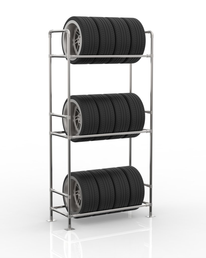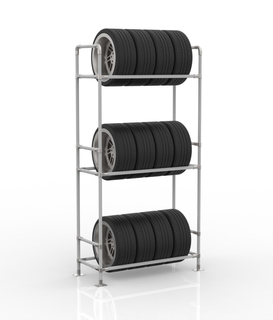 Stojan na pneumatiky z rúrkového stavebnicového systému s tromi policami. Praktické skladovanie až 12 pneumatík na troch poschodiach. Ideálne pre pneumatiky s rozmermi 16" až 20", súčasťou stojana sú štyri kotviace pätky. Pneumatiky nie sú súčasťou. Nosnosť police 100 kg, celková nosnosť 300 kg. Rozmery 2000 x 1127 x 465 mm.