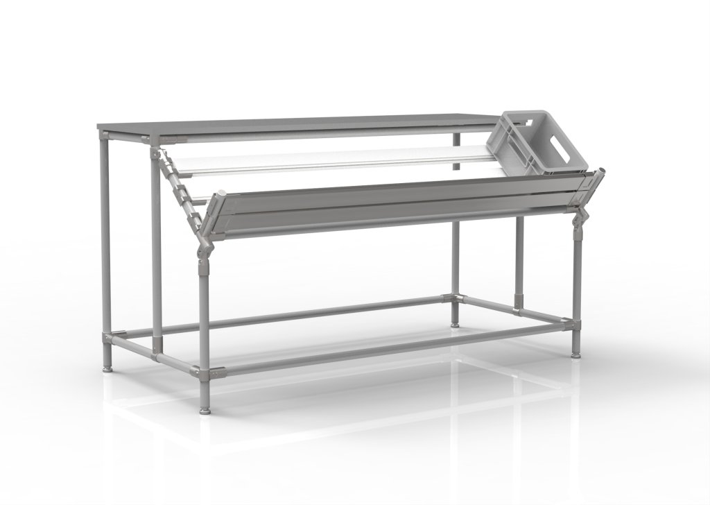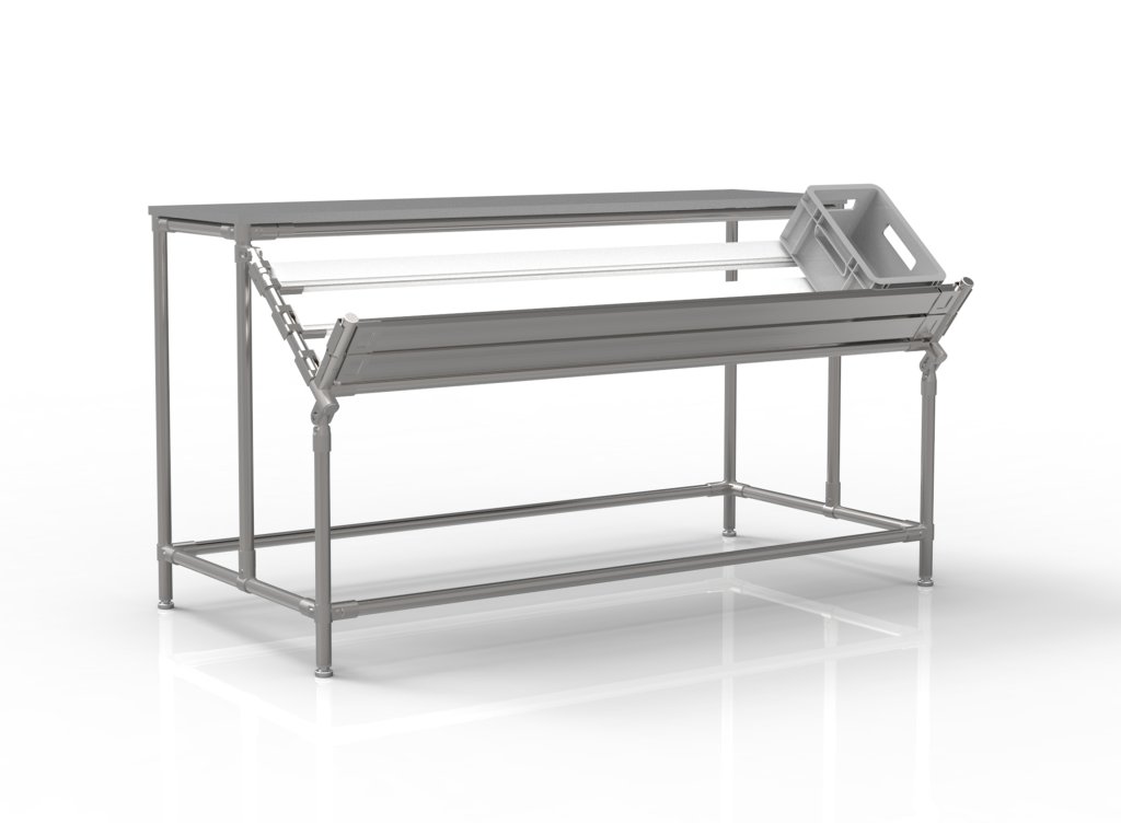 Univerzálny stôl na prepravky. Farba konštrukcie voliteľná podľa rúrok. Pri rovnomernom zaťažení nosnosť 150 kg. Stôl je vhodný pre e-shopy, logistické centrá a sklady. Rozmery 829 x 1500 x 720 mm.