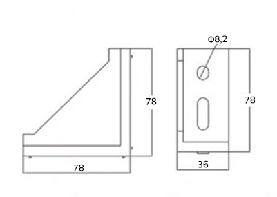 Uholník s uhlom 90° na spájanie profilov. Bočná výstuha zabezpečuje vysokú pevnosť spoja. Hrúbka steny je 6,5 mm, hrúbka výstuhy 3,5 mm. Rozmery 78 x 36 x 78 mm.