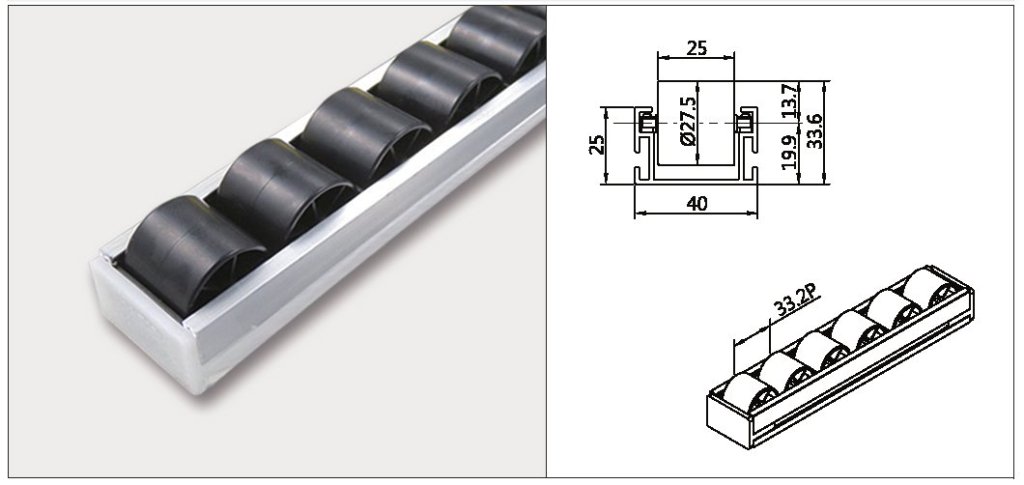 Valčeková dráha šírky 40 mm, celková dĺžka 4000 mm. Hliníkové telo, priemer valčekov 27,5 mm, antistatické prevedenie ESD. celý popis a parametre