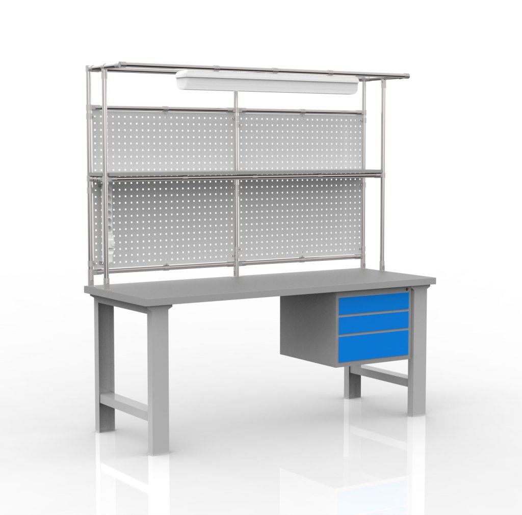 Výškovo nastaviteľný dielenský stôl s nadstavbou z rúrkového systému. Súčasťou stola je pracovná doska z bukovej škárovky, závesný kontajner s tromi zásuvkami, perforovaný panel na zavesenie boxov alebo náradia, polica z laminovanej dosky, zásuvka s vypínačom, LED osvetlenie. Výška pracovnej plochy nastaviteľná v rozsahu 830 - 1070 mm. Nosnosť pri rovnomernom zaťažení je 300 kg, nosnosť police 30 kg. Rozmery 2080 x 2000 x 750 mm.