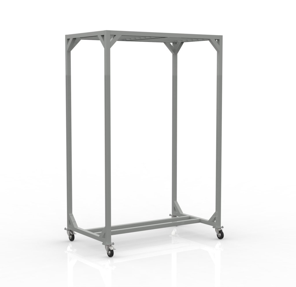 Zváraná konštrukcia na zavesenie. Táto robustná konštrukcia je ideálnym riešením pre priemyselné prevádzky, kde je potrebné zabezpečiť bezpečný prenos dielov po tepelnej úprave. Konštrukcia zo zváraného joklu s rozmermi 45 x 45 mm je opatrená šedým lakom. Súčasťou sú 2 kolieska s brzdou a 2 kolieska bez brzdy s priemerom 100 mm. Nosnosť je 500 kg. Rozmery sú 2300 x 1500 x 900 mm.